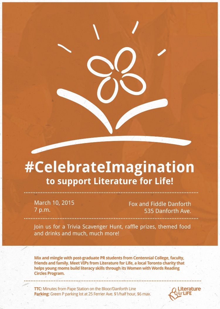 On Tues. March 10, the PR students are hosting #CelebrateImagination in support of Literature for Life, a non-profit organization in Toronto that is doing their best to help women who face these issues develop skills in order to live better lives. These women are mothers, daughters, sisters, aunts, friends, cousins and neighbours.