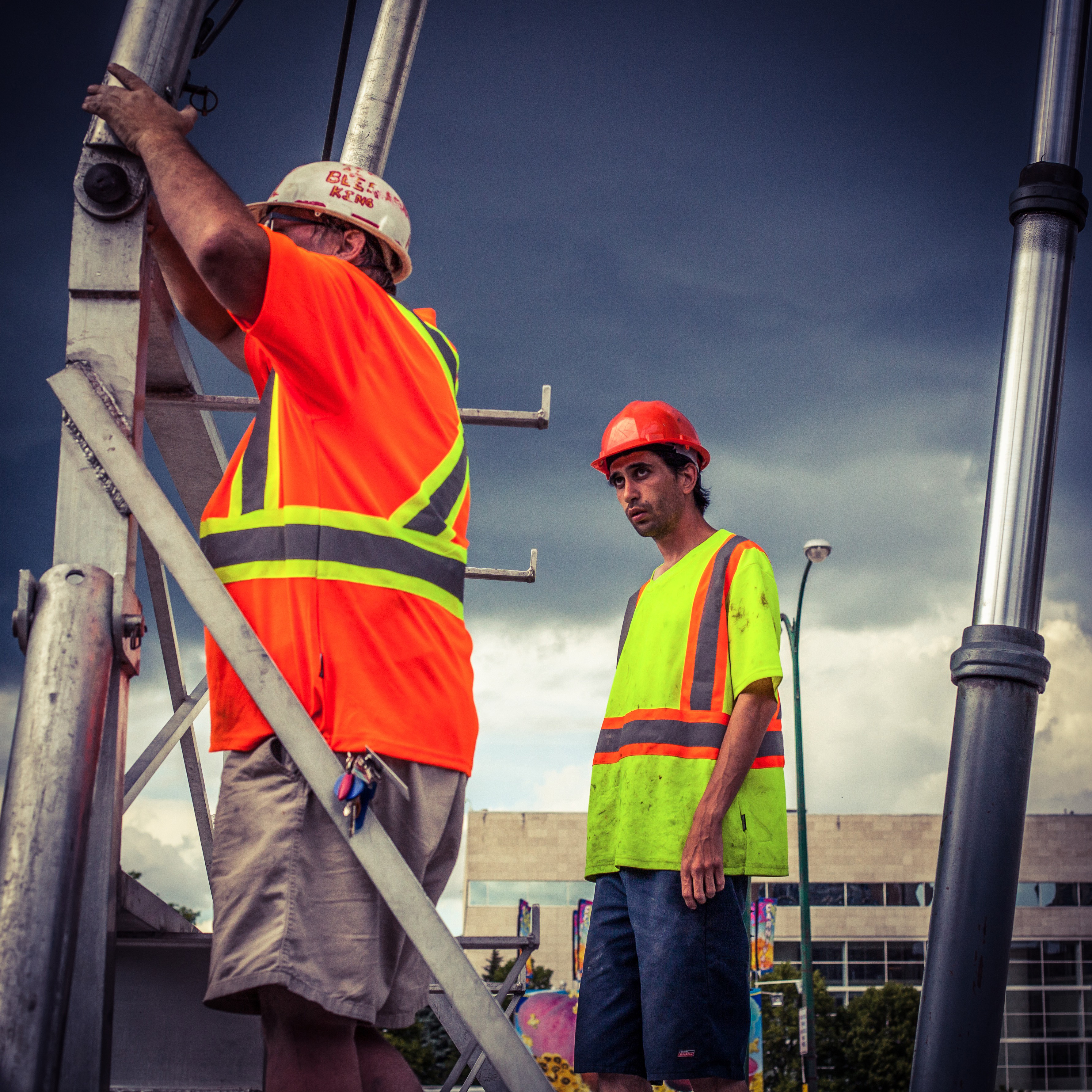 Two men working under a dark sky behind Great West Life. Photo by: Greg Gallinger. @greggallinger/@everydaywinnipeg